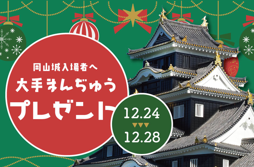 日頃の感謝を込めまして、クリスマス~年末年始にかけての期間のうち、岡山城に入場した方、先着各日200名に岡山城オリジナルパッケージの大手まんぢゅうを無料配布します。