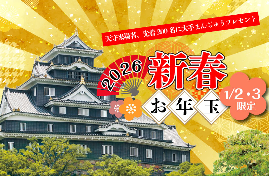 お正月に岡山城の天守に来場した方、各日先着200名に、オリジナルパッケージの大手まんぢゅうをプレゼントします。