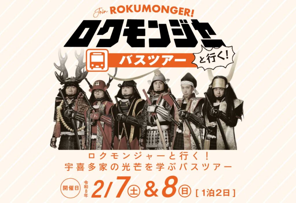 動乱の時代に輝きを放ち、岡山の礎を築いた宇喜多家。その光芒を歴史好き芸人ユニット「ロクモンジャー」と巡るバスツアーが実施されます。