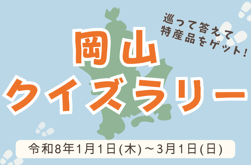 岡山城・足守プラザ・たけべ八幡温泉の3施設を巡って、用意された3択クイズの解答を集めて応募すると抽選で岡山の特産品が当たります!