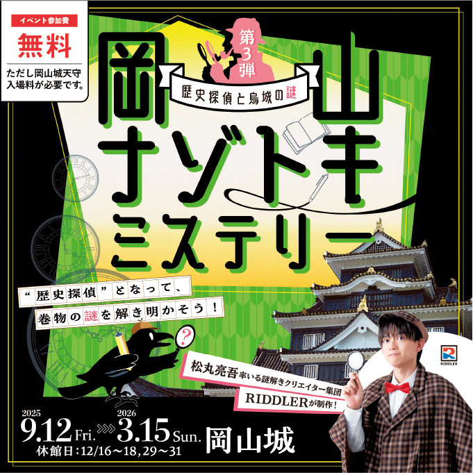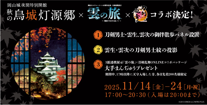 対岸の岡山後楽園では、同時期に「秋の幻想庭園」を開催。秋の夜のひととき、旭川を吹き抜ける風を感じながら、そぞろ歩きをお楽しみください。
