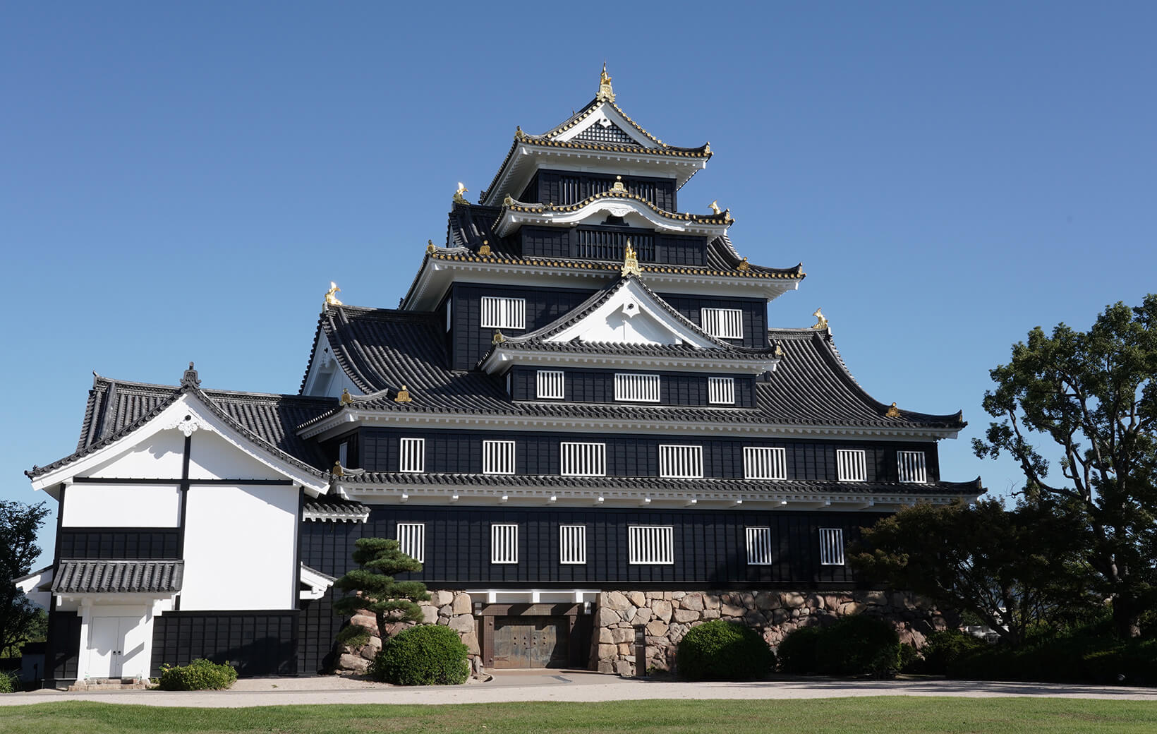 오카야마성의 천수각은 도요토미 히데요시의 오사카성이 그랬던 것처럼, 외벽이 검게 칠해진 판자로 덮여 있었기 때문에 우조(까마귀성)라는 별칭으로 불렸습니다. 또한 발굴 조사를 통해 우키타 히데이에 시대의 금박기와가 출토되었는데, 축성 당시에는 성내의 주요 건물 여러 곳에 금박기와가 사용되었음을 볼 수 있으며, 도요토미 정권의 유력 영주가 가진 위엄을 과시했음을 알 수 있습니다. 이로 인해 긴우조(황금 까마귀성)라고도 불립니다.
