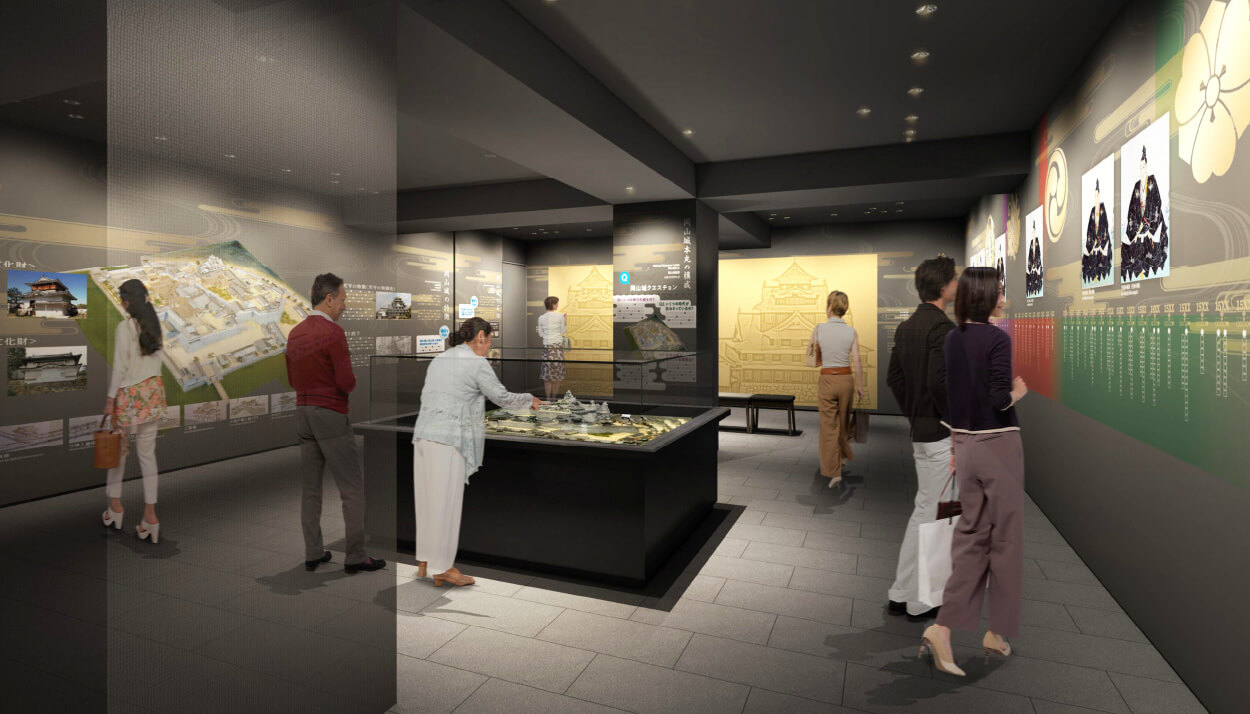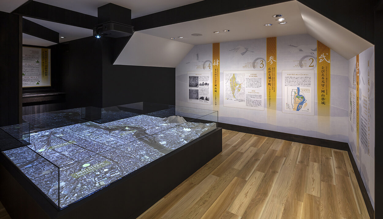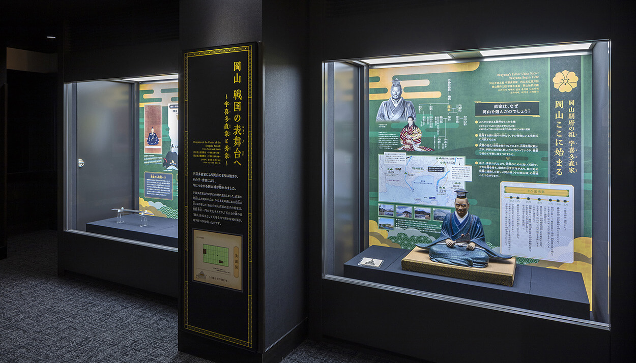ここでは、宇喜多直家と秀家親子、そして天下統一を果たす豊臣秀吉の3人の関係を軸に、岡山のまちが歴史の表舞台に登場し、発展した経緯を紹介しています。