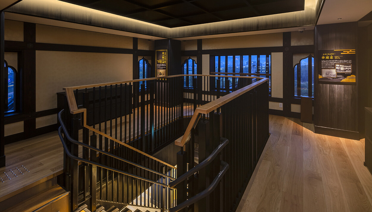 古写真から華頭窓(内部のみ) や、壁の唐紙の再現を試みるなど、戦災で焼失する前の姿に迫ろうとしています。一方で、現在の最上階は、耐震構造にするため、4隅の柱や階段上の脇階段などが設置されています。
