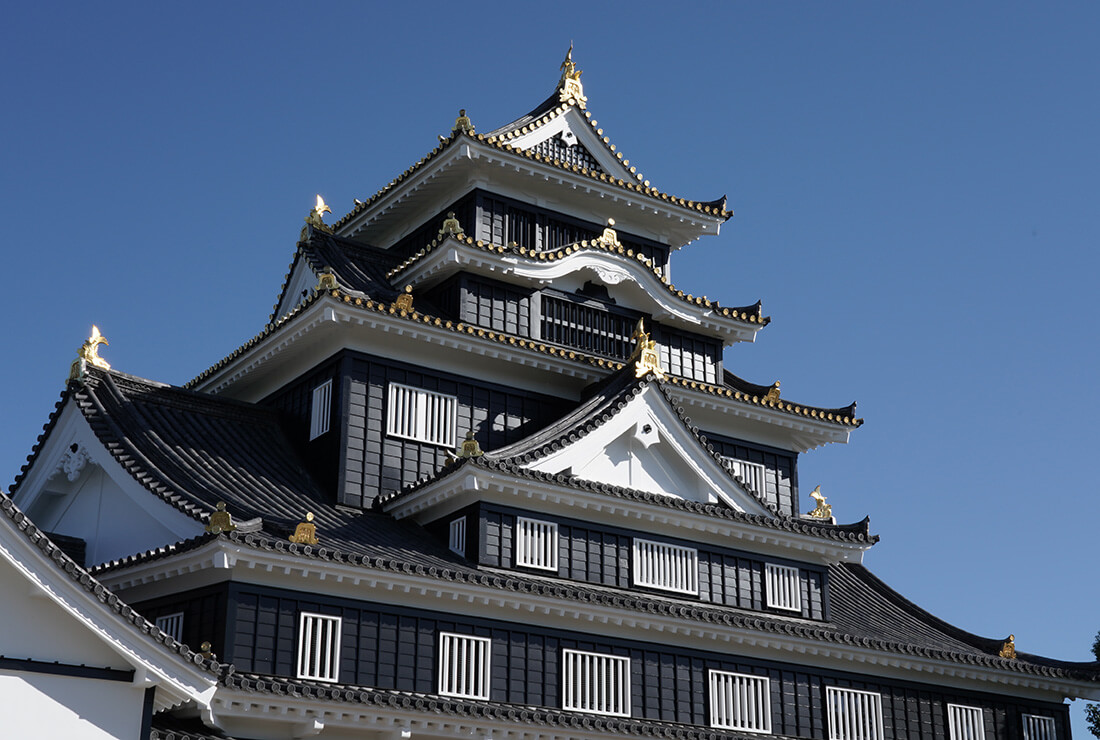 오카야마성의 천수각은 오다 노부나가의 아즈치성과 도요토미 히데요시의 오사카성처럼, 외벽이 검게 칠해진 판자로 덮여 있어서 우조(까마귀성)라는 별명으로도 불립니다. 또한 발굴 조사를 통해 우키타 히데이에 시대의 금박기와가 출토되었는데, 축성 당시에는 성내의 주요 건물 여러 곳에 금박기와가 사용되었음을 볼 수 있으며, 도요토미 정권의 유력 영주가 가진 위엄을 과시했음을 알 수 있습니다. 이로 인해 긴우조(황금 까마귀성)라고도 불립니다.