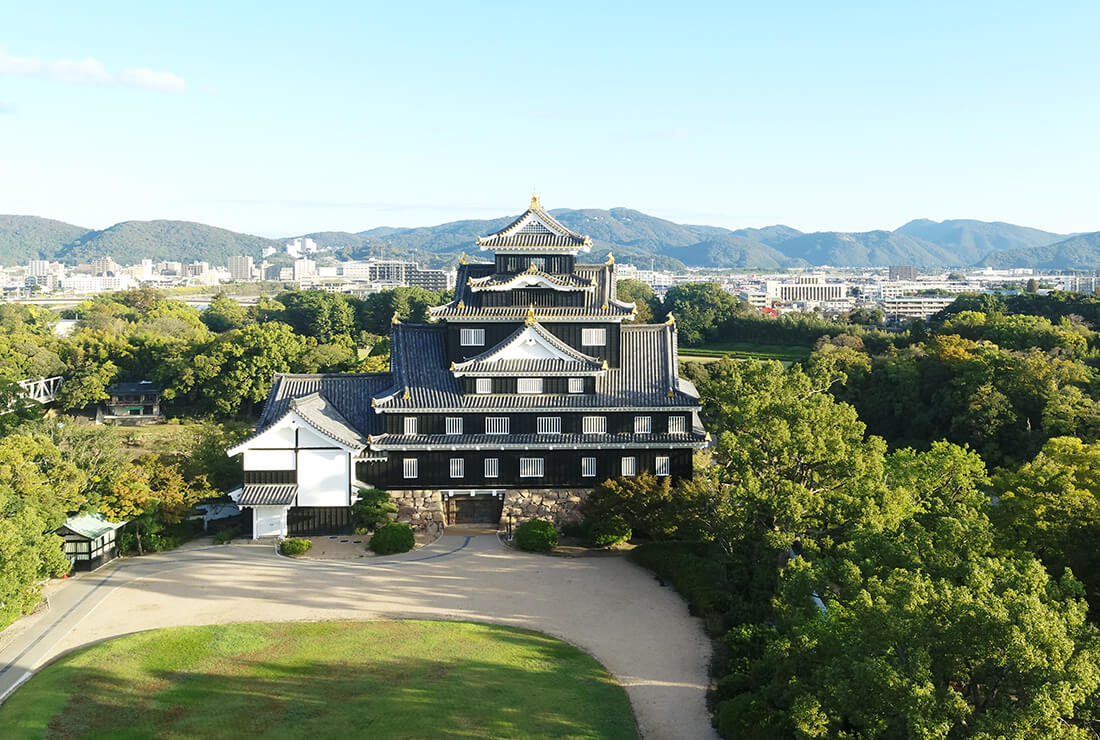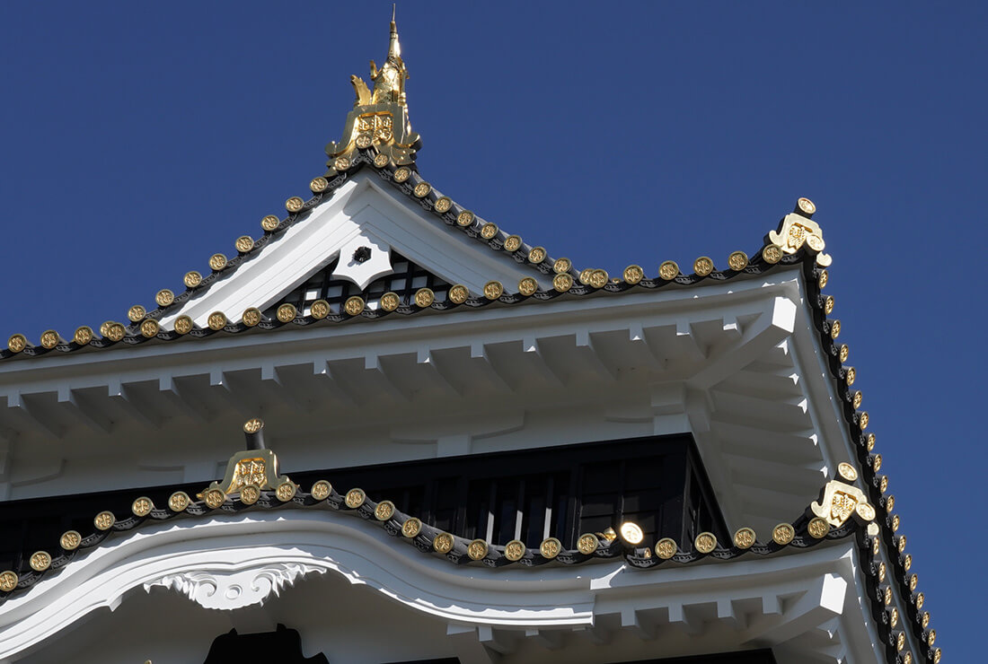 岡山城の天守は、豊臣秀吉の大坂城がそうであったといわれるように、外壁は黒塗りの下見板で覆われていて、烏城(うじょう=「う」はカラスの意味)の別名があります。また、発掘によると、宇喜多秀家時代の金箔瓦が出土しており、築城時には、城内の主要な建物の随所に金箔瓦が用いられ、豊臣政権下の有力大名である威厳を示していたことでしょう。これにより金烏城とも呼ばれます。